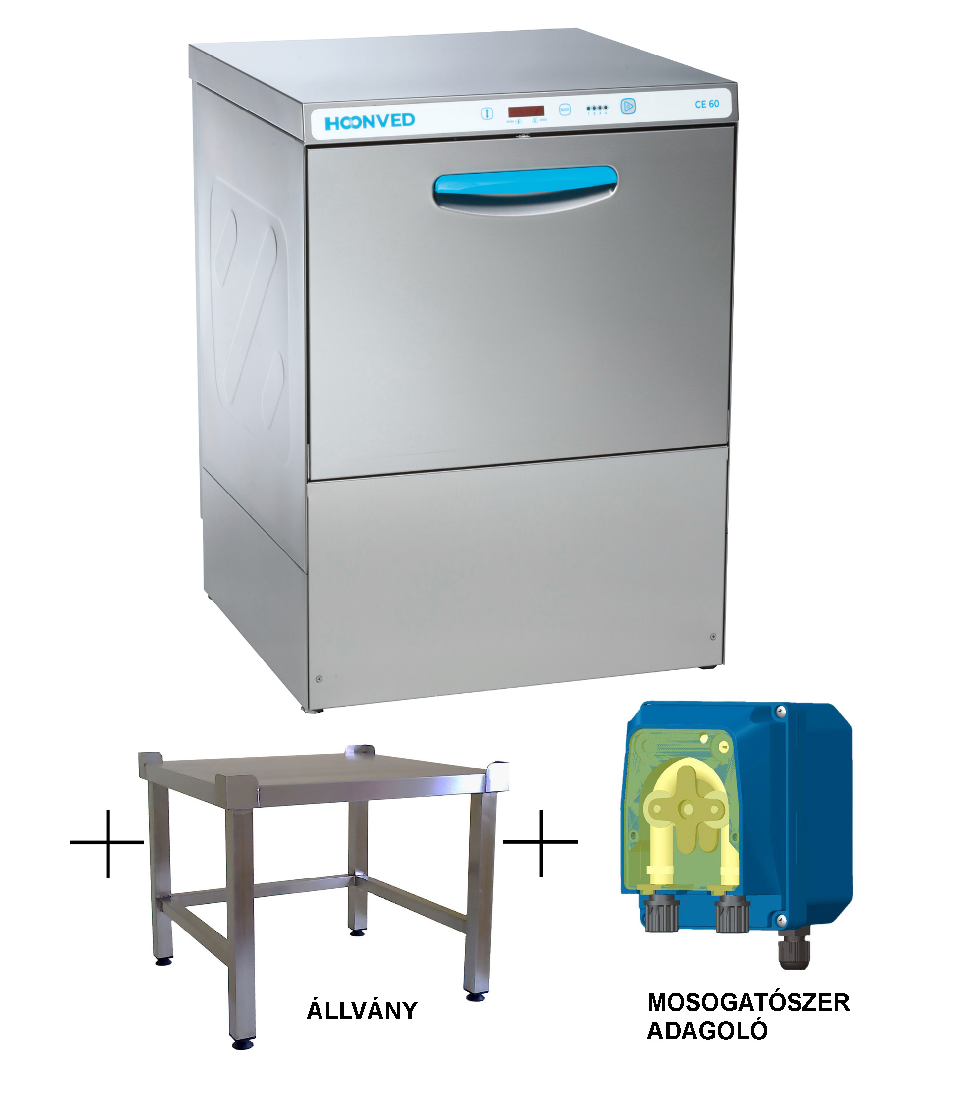 Típus: Hoonved CE60 PD, Megnevezés: tányér- és pohármosogatógép, Felhasználás: ipari, nagykonyhai, Kivitel: fronttöltésű, Kosárméret (mm): 500x500, Belső magasság (mm): 350, Ciklusidő (perc): 2-3-4-8, Mosogatási telj. (kosár/óra): 30-20-15-7, Mosogatási teljesítmény (tányér/óra): 540-360-270-135, Kivitel: szimplafalú, Szélesség (mm): 600, Mélység (mm): 605, Magasság (mm): 820, Elektr.csatl. (V): 400 3 fázis, Elektr.telj. (W): 5450, Tányérkosár (darab): 1, Pohárkosár (darab): 1, Evőeszközbetét 4 fakkos: 1, Vezérlőpanel: érintőgombos, Hőmérsékletkijelzés: digitális, Öblítőszer adagoló: van, Mosogatószer adagoló: van, Ürítőszivattyú: nincs, Vízfogyasztás (liter/ciklus): 3,5, Rozsdamentes állvány: van, Biztonsági kapcsoló: van, Automata vízfeltöltés- és fűtés: igen, Biztonsági thermosztát: van, Vízbetápcső: tartozék, Szennyvízcső: tartozék, Anyaga: rozsdamentes acél, 12 V-os törpefeszültségű kezelőpanel, Polírozott kosártartó ütközővel, Kiegyensúlyozott duplafalú ajtó, Ergonomikus félig rejtett ajtófogantyú, Lekerekített fedéllemez, Egy mozdulattal leemelhető mosó és öblítőkarok a könnyű karbantartáshoz, Öntisztító préselt lekerekített mosótank fenéklemez, Termo stop rendszer garantálja a forróvizes öblítést, Soft start indítási rendszer a poharak és könnyű tárgyak kíméletes mosogatásához, Digitális hőmérsékletkijelzés a mosó- és öblítővízhez, Multifunkcós START gomb, 4 különböző program, Fennmaradó ciklusidő visszaszámlálás kijelzés, Hibadiagnosztikai rendszer.